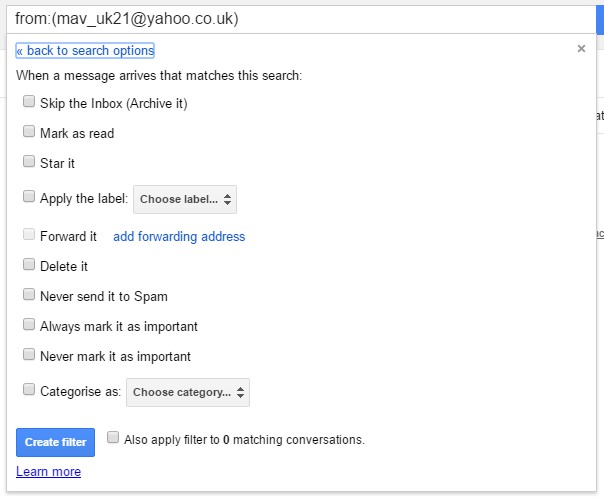 然后输入邮箱地址在发件人文本框中阻止。您也可以在那里输入多个地址,用 | 分隔它们。竖条。例如,您可以在“发件人”文本框中输入两个电子邮件地址作为“news-googleplay@google.com|mav_uk29@yahoo.co.uk”。
