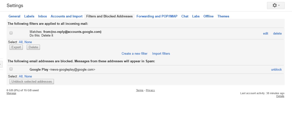 要删除过滤器,请按设置按钮并从菜单中选择设置。单击过滤器和阻止的地址选项卡以打开您的过滤器和阻止的电子邮件地址列表,如下所示。然后你可以在那里选择一个过滤器,然后点击删除将其删除。