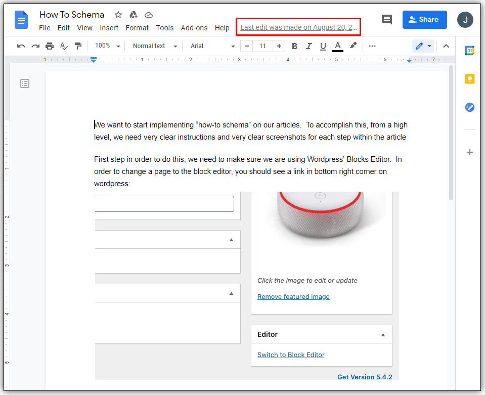 - 将启动一个新页面,您可以在其中查看对文档所做的所有编辑。完整的编辑历史将显示在屏幕右侧,文档的当前版本显示在左侧。右侧的编辑历史具有时间戳,以显示文档被编辑的确切时刻。