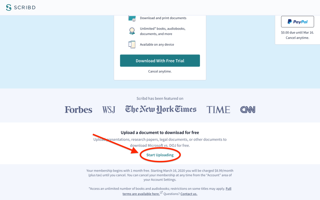 这会将您重定向到一个旨在帮助您设置Scribd 订阅,完成 30 天免费试用。但是,这样做需要输入付款信息,我们希望避免这种情况。因此,请向下滚动,直到在此页面底部附近看到 开始上传。