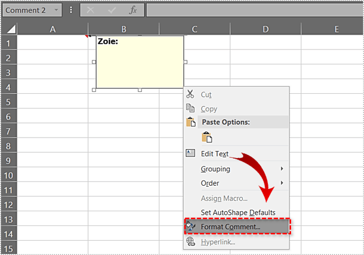 - 进入“评论”选项卡并点击新评论,或右键单击一个单元格并从下拉菜单中选择 Insert Comment。您可以也按 Shift + F2。