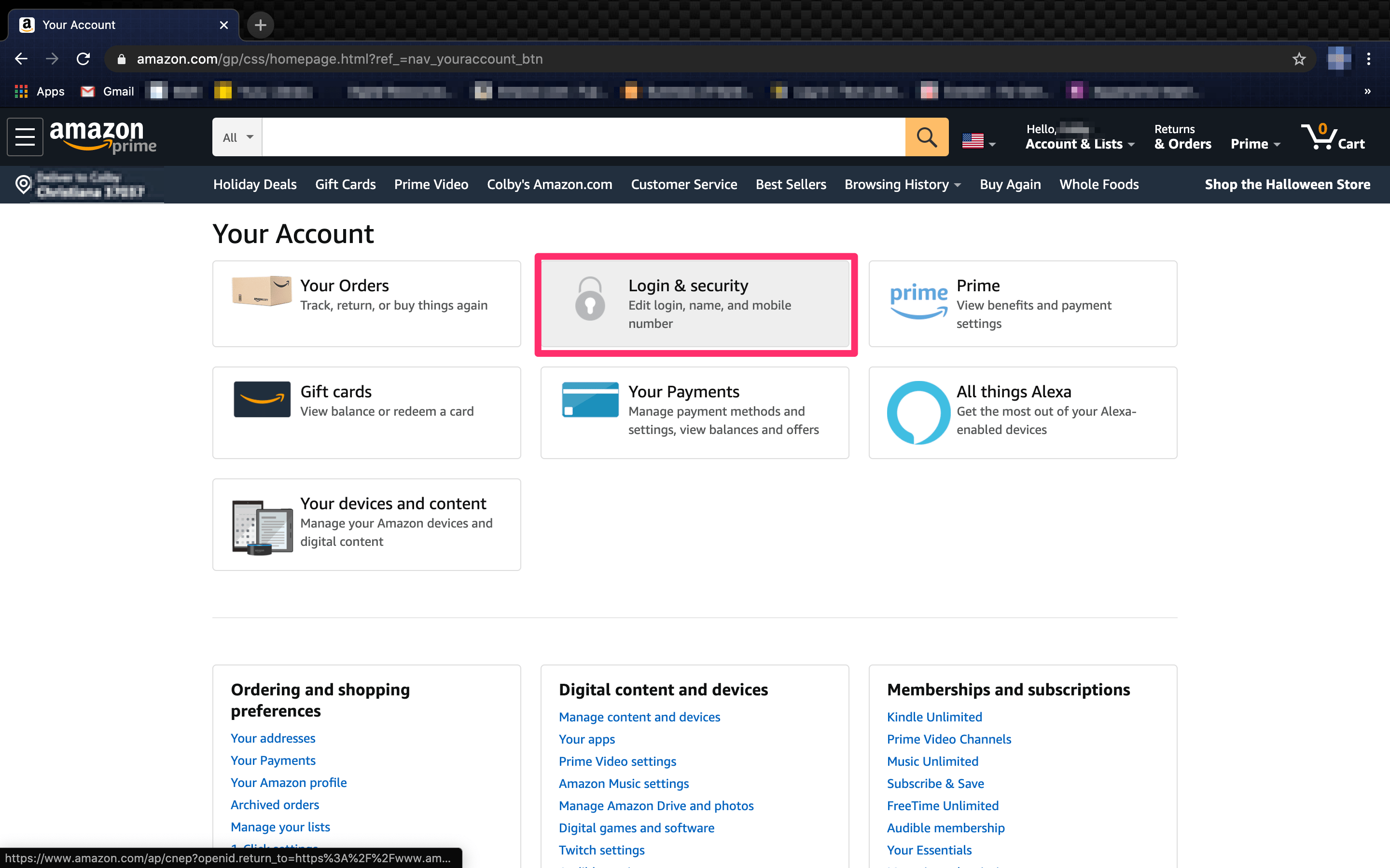 - 从您的亚马逊主页,点击登录并安全。