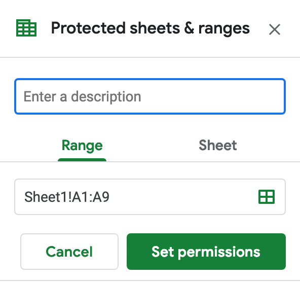 之后,您会看到一个框,让您可以为有权访问文档的用户选择不同的用户权限。从这里,您可以选择哪些成员可以编辑受保护单元格的范围(如果有的话)。如果他们没有权限,尝试编辑它们会给用户一条错误消息。此外,任何受保护的单元格都会在主页上显示一个方格框。