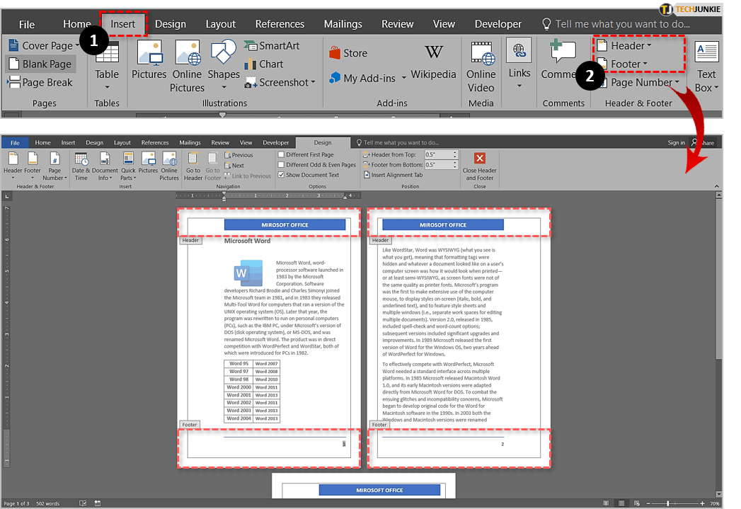 当你在做的时候,为什么不利用其他 Word 编辑工具来进一步改进小册子呢?单击插入选项卡并向文档添加页眉和页脚。在同一选项卡中,您还可以添加页码以获得完整、专业的小册子。