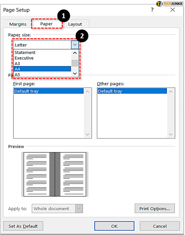 接下来,单击页面设置窗口中的纸张选项卡。根据您的打印偏好,您可以从“纸张尺寸”下拉菜单中选择不同的尺寸。