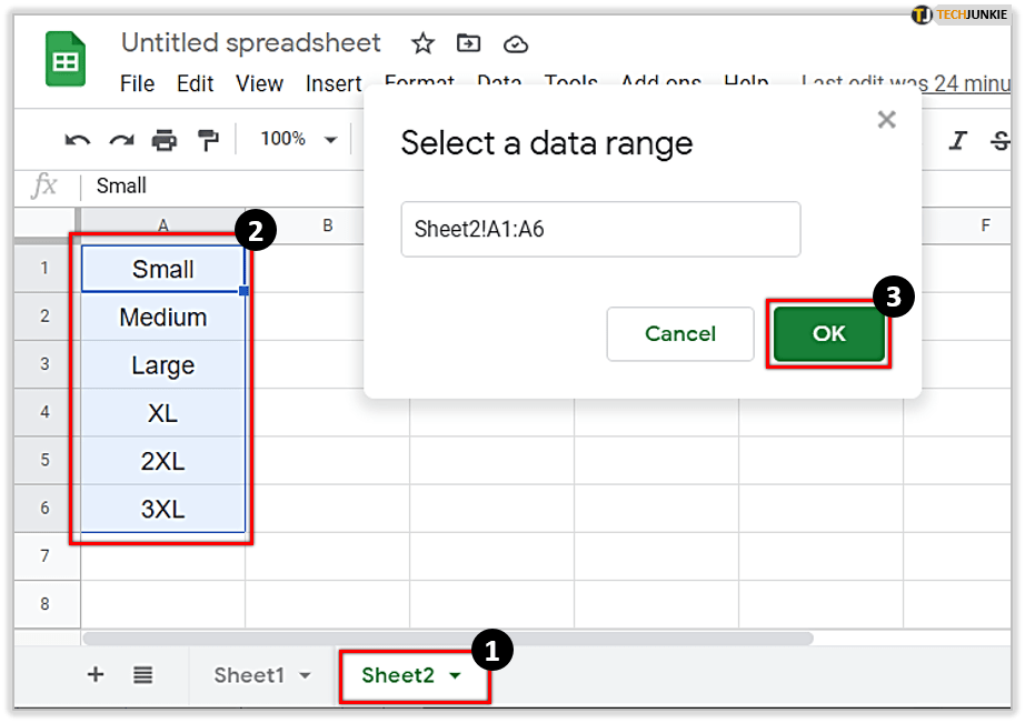 6. 单击 Sheet2 并在此处手动选择要显示在下拉列表中的数据。完成后点击“确定”。