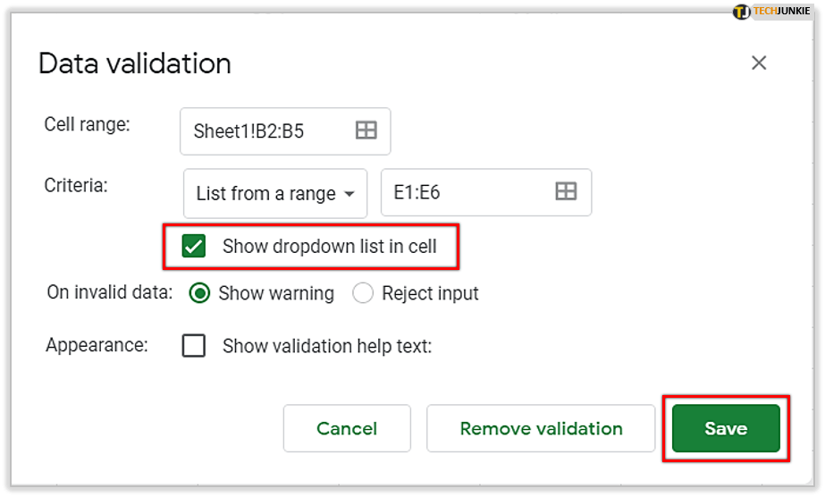 7. 确保选中“在单元格中显示下拉列表”。如果您愿意,可以添加帮助文本和错误信息,然后单击“保存”。