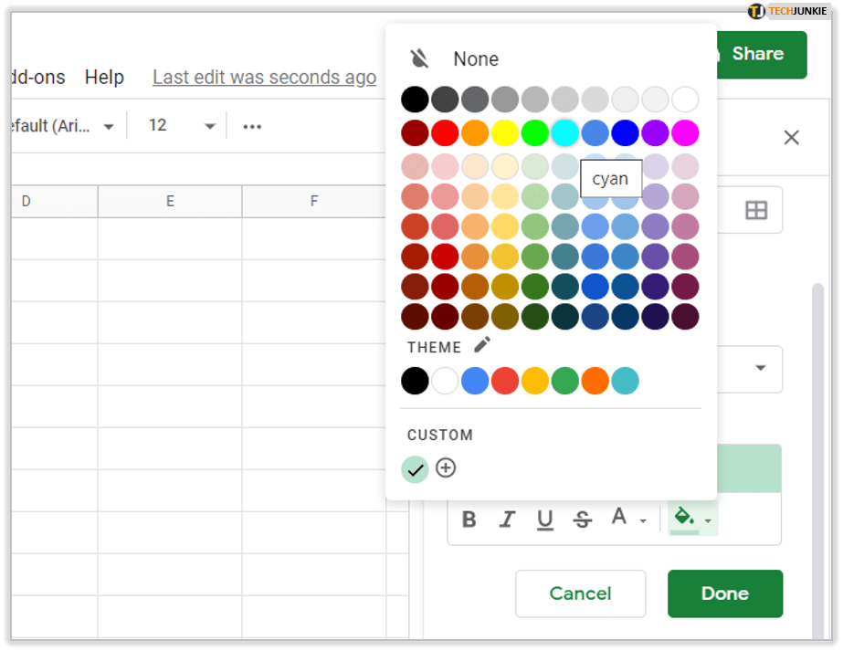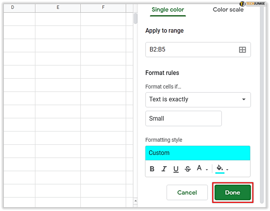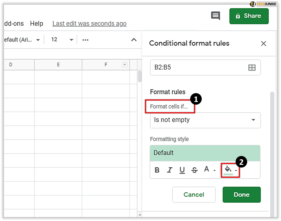 3. Google 表格右侧会出现一个弹出窗口。在“如果...格式化单元格”中选择格式化条件,在右下角您会看到一个油漆桶图标;点击那个。