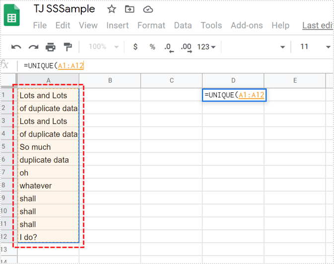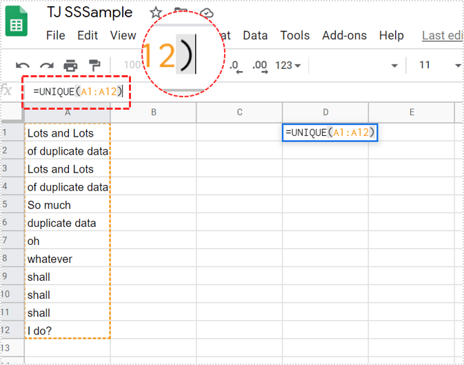 - 关闭括号以完成公式。在示例图像中,它看起来像 '=UNIQUE(A1:A12)',其中我选择了 A 列的第 1 到 12 行。