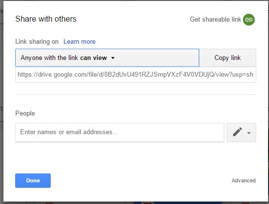 有关更多链接共享选项,请单击共享设置打开下图中的窗口。然后您可以按复制链接按钮将超链接复制到剪贴板。单击知道链接的任何人框以选择文件的访问级别。