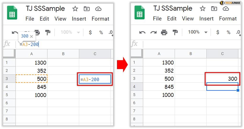您可以使用普通数字、单元格引用或两者。例如,键入“=A3-200”将为您提供单元格 A3 减去 200 的值。就像 Excel 中的函数一样,在 Google 表格中,您以等号开头。
