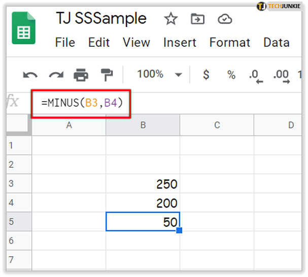 要将 MINUS 函数添加到工作表,请在Google 表格。作为例如,在单元格 B3 中输入“250”,在单元格 B4 中输入“200”。选择单元格 B5 并在功能栏中输入‘=MINUS(B3, B4)’。当您按 Enter 时,单元格 B5 将返回值 50。
