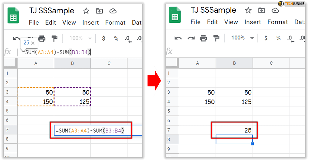 现在选择 B7 并在 fx 栏中单击。在功能栏中输入‘=SUM(A3:A4)-SUM(B3:B4)’,按回车键。单元格 B7 将从 B 列中扣除总计m 列 A,等于 25。