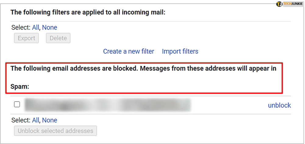 - 查找标有“以下电子邮件地址已被阻止。来自这些地址的邮件将显示在垃圾邮件:”部分。