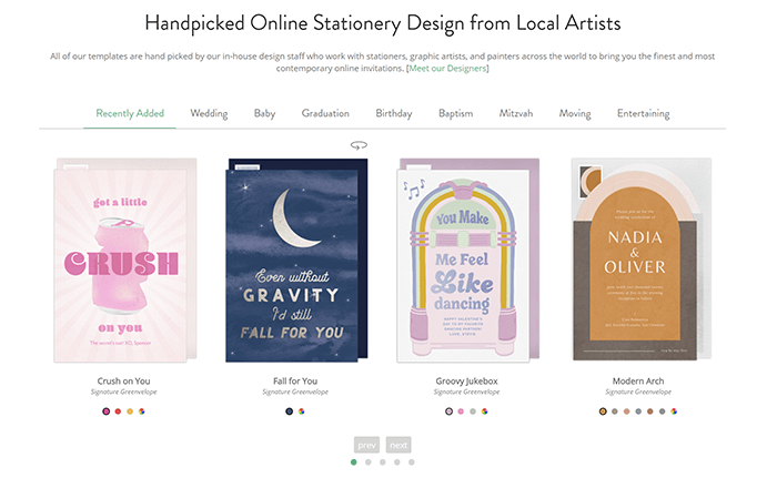 我们对数字邀请的最终建议是 Greenvelope,正如您从名称中猜到的那样,他们以通过在线帮助减少纸张浪费而自豪邀请。该网站采用简洁、可定制的邀请设计,适用于您可能计划的任何活动,并按类别分类,以便轻松找到适合您的卡片。从洗礼和成人礼到毕业典礼和婚礼,Greenvelope 基本上可以满足您计划的任何活动。