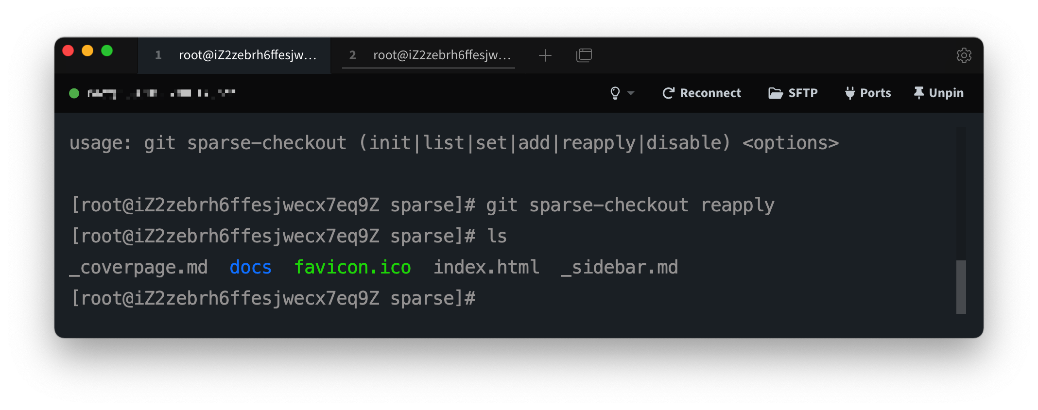 比如说,我们只想拉取 docs 目录,可以执行 git sparse-checkout set docs 命令,