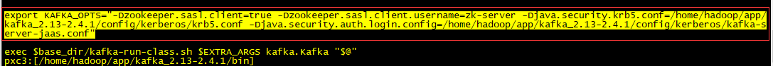 export KAFKA_OPTS="-Dzookeeper.sasl.client=true -Dzookeeper.sasl.client.username=zk-server -Djava.security.krb5.conf=/home/hadoop/app/kafka_2.13-2.4.1/config/kerberos/krb5.conf -Djava.security.auth.login.config=/home/hadoop/app/kafka_2.13-2.4.1/config/kerberos/kafka-server-jaas.conf"