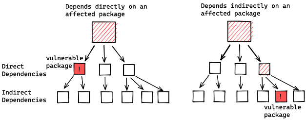 如记录漏洞的 CVE 所述,大多数受影响的软件包来自间接依赖项(即自身依赖项的依赖项),也就是说它们没有将 log4j 明确定义为依赖项,而是作为传递依赖项被引入进来,