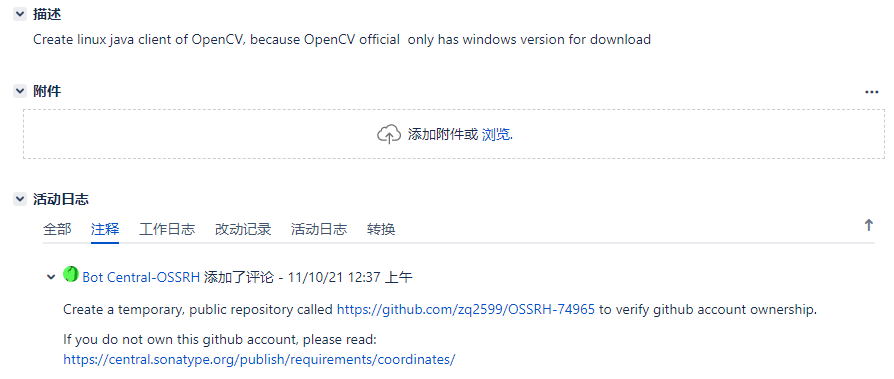 • 上述内容在刚才新建的issue页面也能看到,如下图,即sonatype的评论: