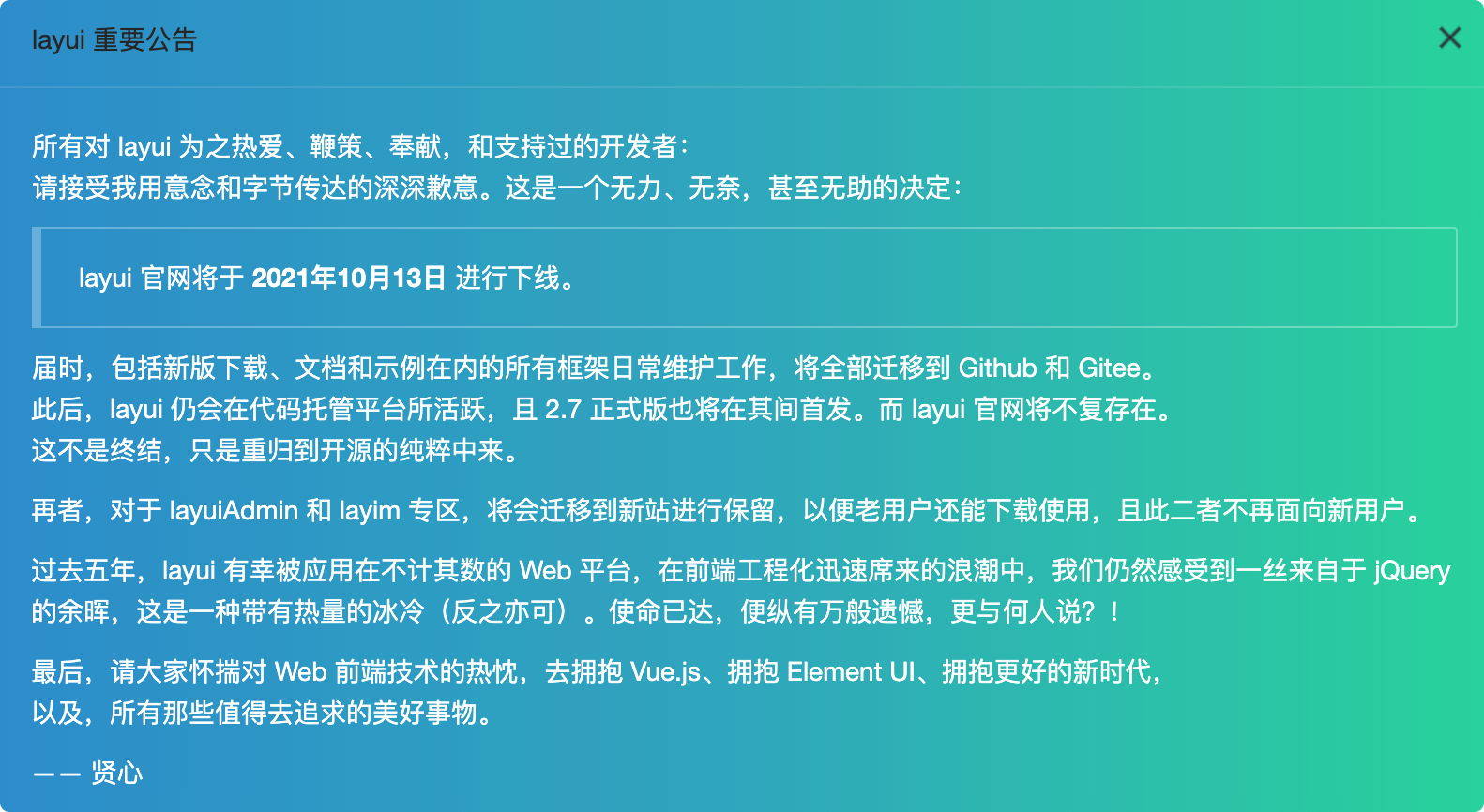 需要注意的是,LayUI 仅仅是从官网下线,但并不意味着终结,并不意味着 LayUI 的停止维护,后续新版本的发布,以及日常维护作业已经迁移到 Github/ gitee 代码托管平台了,