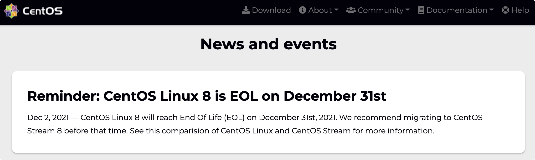 CentOS Linux 8 已于 2021 年 12 月 31 日终止: