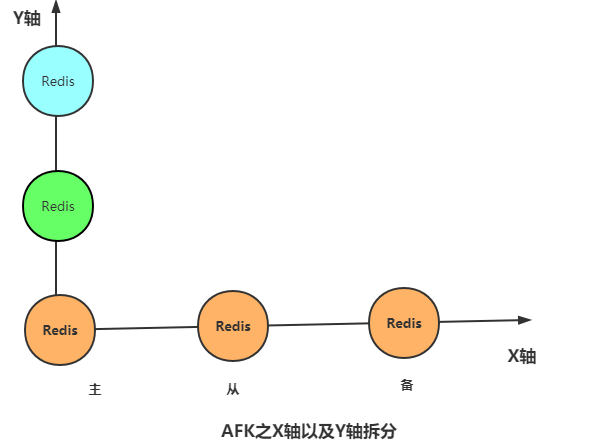 特点是Y轴纵向来看不同的Redis负责的功能是不同的,也就是所包含的资料也是不同的,另外仅仅扩展出一个Y轴上的业务服务器,又可能会存在单点问题,所以可以结合AFK的X轴拆分原则,继续对刚拆分的Y轴上的点进行X轴拆分,