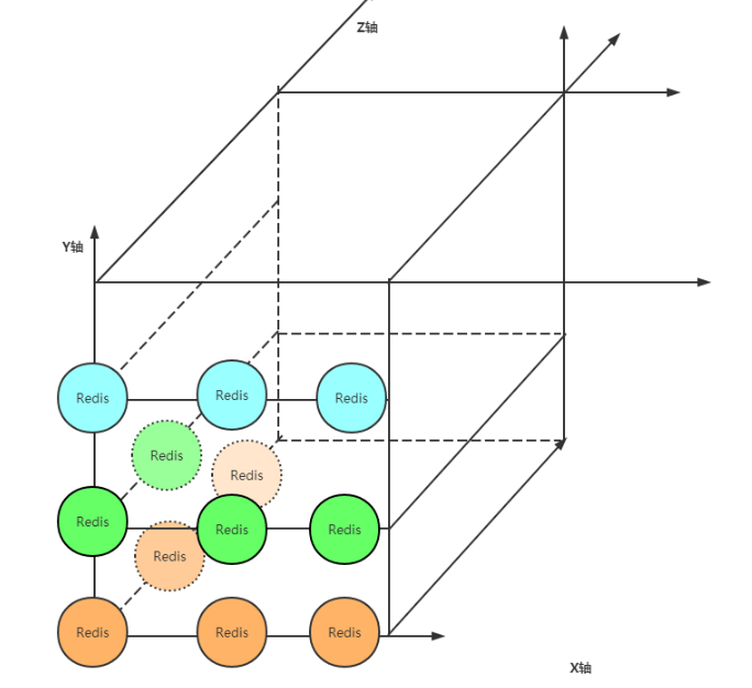 在上面的AFK原则X-Y拆分之后,对服务器显示做了主从主备复制,然后做了业务拆分,不同的Redis负责不同的业务请求,这时候还会有一个新的问题,例如对于Y轴上一个Redis,它负责某一样业务,但是这天这个业务的资料访问巨大,贼大,那就只好对资料请求进行AFK的Z轴拆分,例如先分析下资料请求的情况,然后根据访问来源,分为北京的、上海的,这样不同的Redis虽然是负责不同的资料,但是负责的业务是一样的,AFK拆分图示: