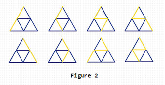 当i=2时,对应图中上两行,边长为1的小三角形有4个,其中3个顶点向上(红色三角形),1个顶点向下(白色三角形);边长为2的三角形有1个,所以,a[2]=5,