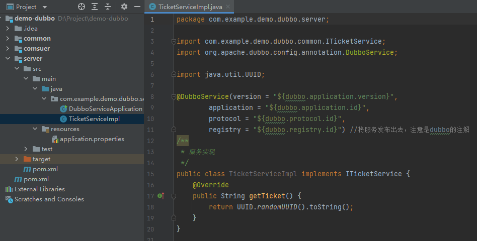 import com.example.demo.dubbo.common.ITicketService; import org.apache.dubbo.config.annotation.DubboService; import java.util.UUID; @DubboService(version = "${dubbo.application.version}", application = "${dubbo.application.id}", protocol = "${dubbo.protocol.id}", registry = "${dubbo.registry.id}") //将服务发布出去,注意是dubbo的注解 /** * 服务实作 */ public class TicketServiceImpl implements ITicketService { @Override public String getTicket() { return UUID.randomUUID().toString(); } }