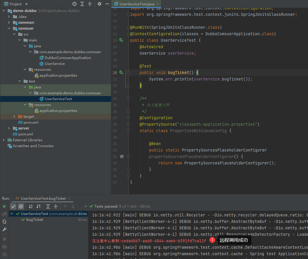 import com.example.demo.dubbo.common.ITicketService; import org.apache.dubbo.config.annotation.DubboReference; import org.springframework.stereotype.Component; /** * 服务呼叫 */ @Component public class UserService { @DubboReference(version = "${dubbo.application.version}", application = "${dubbo.application.id}", registry = "${dubbo.registry.address}") //远程参考指定的服务,他会按照全类名进行匹配,看谁给注册中心注册了这个全类名 ITicketService ticketService; public String bugTicket() { String ticket = ticketService.getTicket(); return "在注册中心拿到:" + ticket; } }