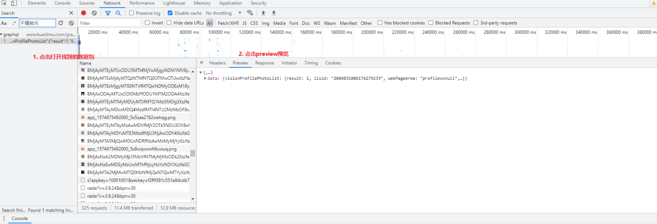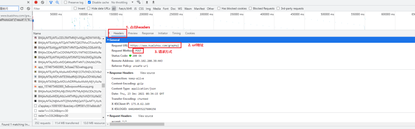 url = 'https://www.kuaishou.com/graphql' # 伪装 headers = { # 控制data型别 json型别字串 'content-type': 'application/json', 'Cookie': 'kpf=PC_WEB; kpn=KUAISHOU_VISION; clientid=3; did=web_ea128125517a46bd491ae9ccb255e242; client_key=65890b29; userId=270932146; kuaishou.server.web_st=ChZrdWFpc2hvdS5zZXJ2ZXIud2ViLnN0EqABnjkpJPZ-QanEQnI0XWMVZxXtIqPj-hwjsXBn9DHaTzispQcLjGR-5Xr-rY4VFaIC-egxv508oQoRYdgafhxSBpZYqLnApsaeuAaoLj2xMbRoytYGCrTLF6vVWJvzz3nzBVzNSyrXyhz-RTlRJP4xe1VjSp7XLNLRnVFVEtGPuBz0xkOnemy7-1-k6FEwoPIbOau9qgO5mukNg0qQ2NLz_xoSKS0sDuL1vMmNDXbwL4KX-qDmIiCWJ_fVUQoL5jjg3553H5iUdvpNxx97u6I6MkKEzwOaSigFMAE; kuaishou.server.web_ph=b282f9af819333f3d13e9c45765ed62560a1', 'Host': 'www.kuaishou.com', 'Origin': 'https://www.kuaishou.com', 'Referer': 'https://www.kuaishou.com/profile/3xauthkq46ftgkg', 'User-Agent': 'Mozilla/5.0 (Windows NT 10.0; Win64; x64) AppleWebKit/537.36 (KHTML, like Gecko) Chrome/97.0.4692.71 Safari/537.36', } # <Response [200]>: 发送请求成功结果 response = requests.post(url=url, headers=headers, json=data)