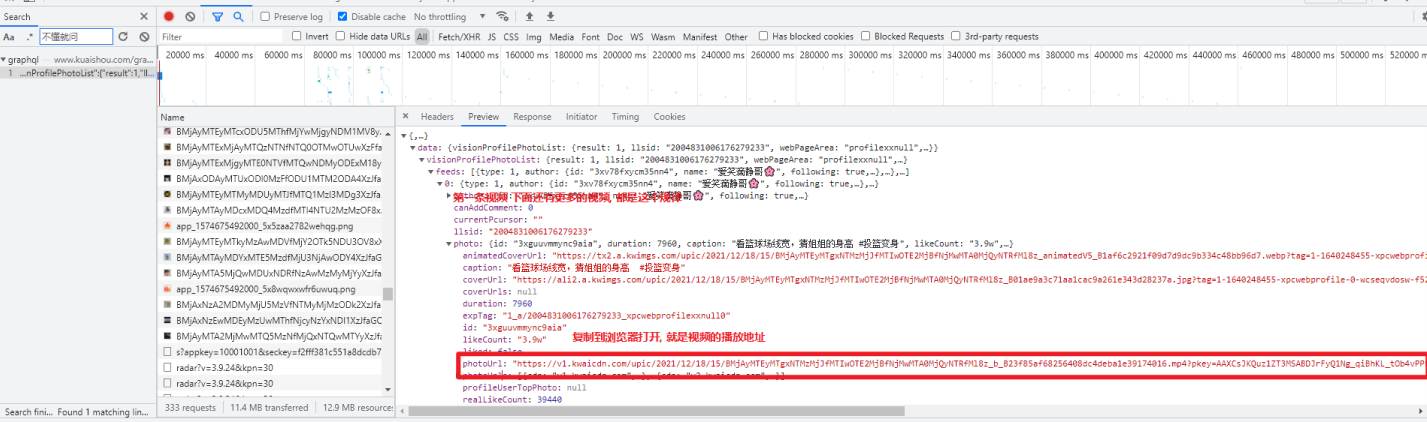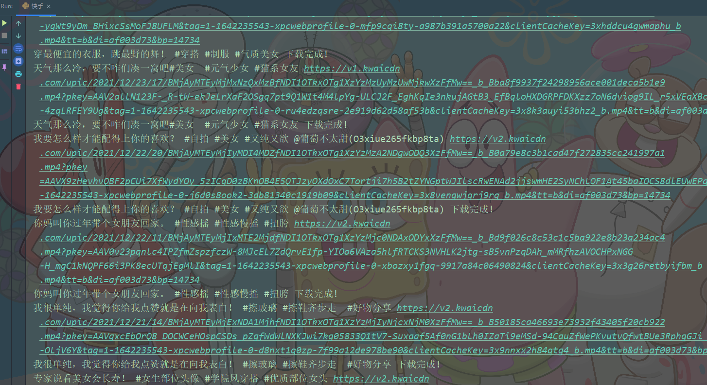 feeds = json_data['data']['visionProfilePhotoList']['feeds'] # 下一页需要的自变量 pcursor = json_data['data']['visionProfilePhotoList']['pcursor'] # print(pcursor) for feed in feeds: caption = feed['photo']['caption'] # 标题 photoUrl = feed['photo']['photoUrl'] # 视频链接 # \: 转义字符, 直接写\ 匹配不到 \ # \\ 才能匹配到 \ # 用css和xpath 是必须要你拿到的资料是一个网页源代码 caption = re.sub('[\\/:*?"<>|\n\t]', '', caption) print(caption, photoUrl)
