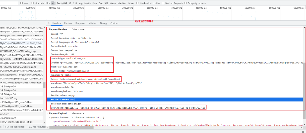 headers = { 'content-type': 'application/json', 'Cookie': '你自己的cookie', 'Host': 'www.kuaishou.com', 'Origin': 'https://www.kuaishou.com', 'Referer': 'https://www.kuaishou.com/profile/3xv78fxycm35nn4', 'User-Agent': 'Mozilla/5.0 (Windows NT 10.0; Win64; x64) AppleWebKit/537.36 (KHTML, like Gecko) Chrome/95.0.4638.69 Safari/537.36' }