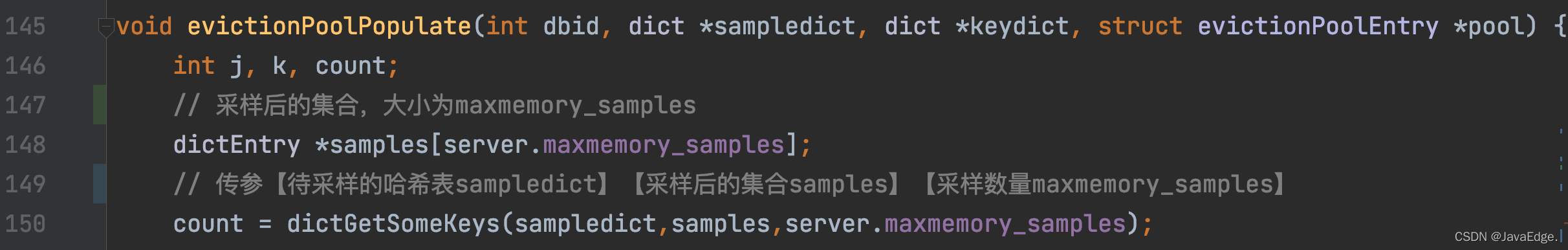 performEvictions呼叫evictionPoolPopulate,其会先呼叫dictGetSomeKeys,从待采样哈希表随机获取一定数量K:
