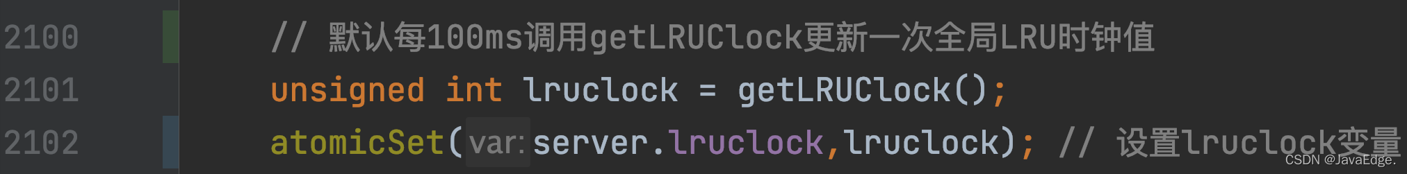 serverCron作为时间事件的回呼函式,本身会周期性执行,其频率值由redis.conf的hz配置项决定,默认值10,即serverCron函式会每100ms(1s/10 = 100ms)运行一次,serverCron中,全域LRU时钟值就会按该函式执行频率,定期呼叫getLRUClock进行更新: