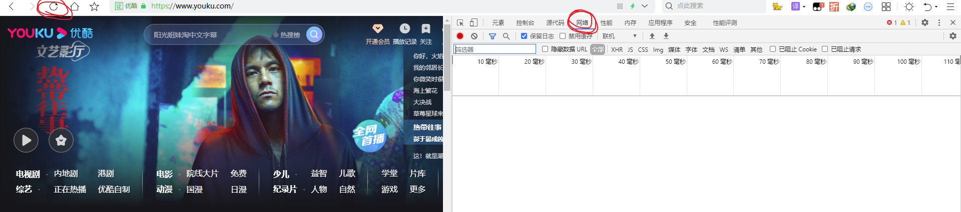 打开 优酷首, 按F12 (这是一个功能键), 打开到网络, 然后重绘浏览器!