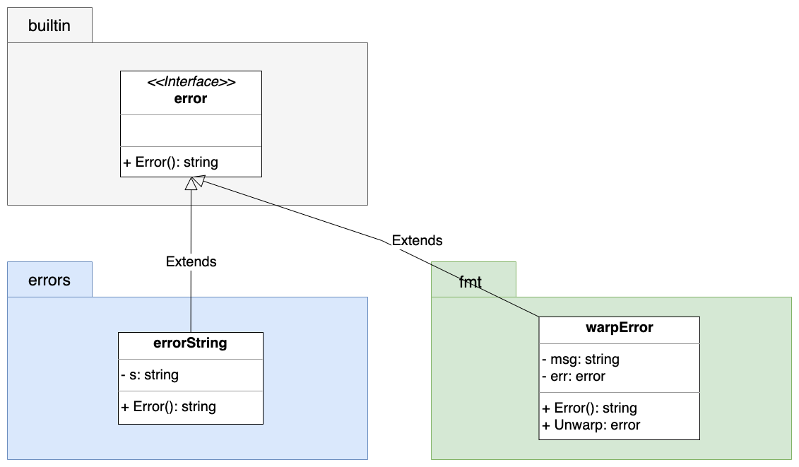 Go 扩展了 fmt.Errorf() 函式,增加了一个 %w 识别符号来创建 wrapError,