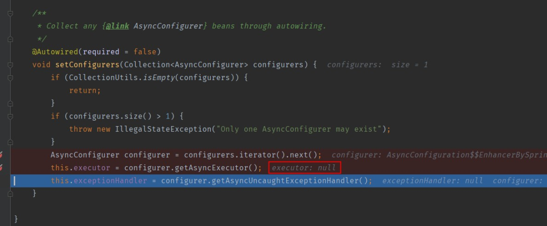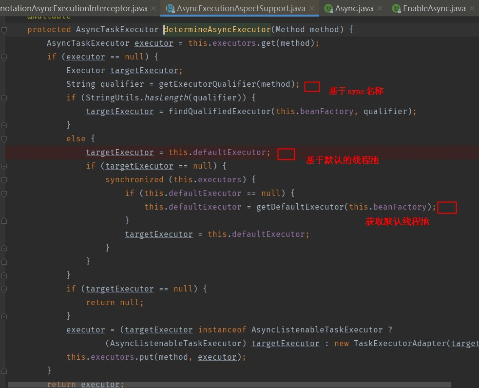 由于AsyncConfigurer的默认执行绪池在原始码中为空,Spring通过beanFactory.getBean(TaskExecutor.class)先查看是否有执行绪池,未配置时,通过beanFactory.getBean(DEFAULT_TASK_EXECUTOR_BEAN_NAME, Executor.class),又查询是否存在默认名称为TaskExecutor的执行绪池,
