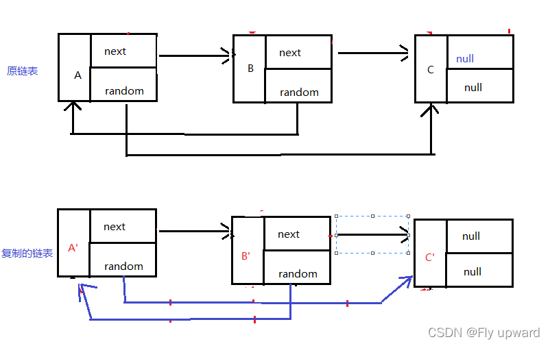 然后再构建新链表的random 指向,当访问原节点 cur 的随机指向节点 cur.random 时,对应新节点 cur.next 的随机指向节点为 cur.random.next