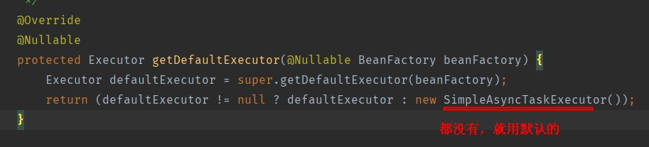 原始码-设定默认执行绪池defaultExecutor,默认是空的,当重新实作界面AsyncConfigurer的getAsyncExecutor()时,可以设定默认的执行绪池,