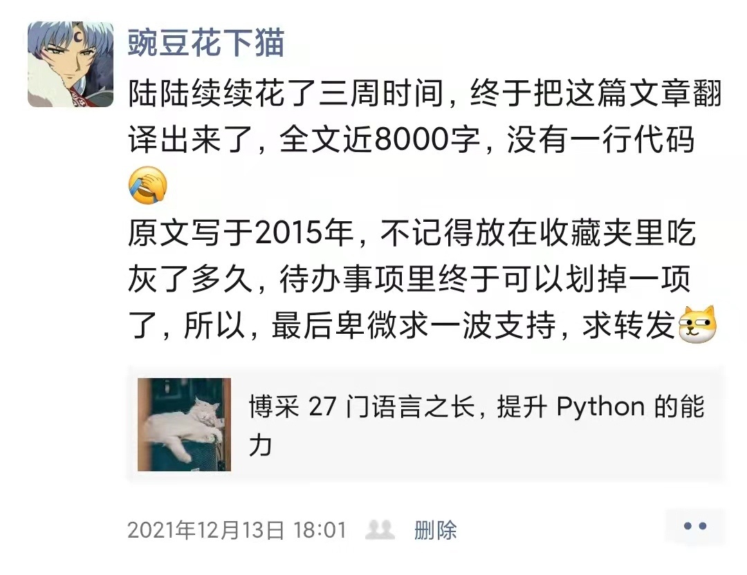 在这些文章里,我重点推荐一下《博采 27 门语言之长,提升 Python 的能力》,原文被我放在收藏夹里真的是太久了,早几年前,我还没有写技术博客和翻译技术文章的习惯,万万想不到有一天能把它翻译出来,甚至一度都把它给忘掉了,