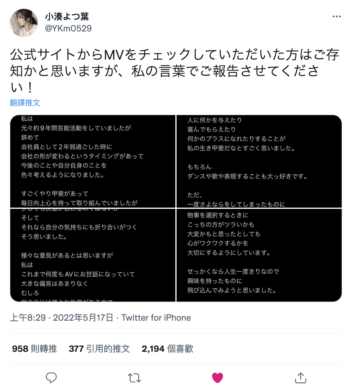 ▲ 小凑よつ叶以长文向粉丝解释为何从事AV。/ @YKm0529
